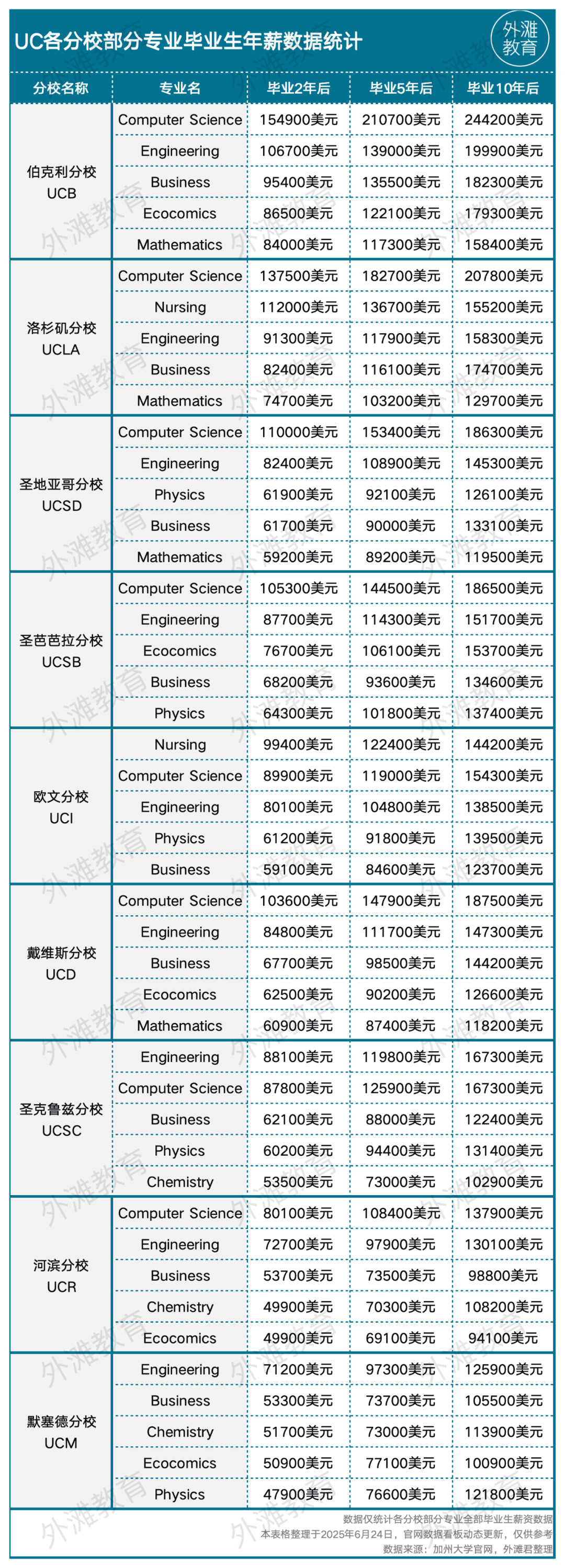 以计较机科学专业(简称CS)为例,4所分校的CS结业生正在结业2年后,年薪即冲破10万美元,大部门CS结业生的年薪都正在16万美元以上。商科结业生的薪资程度稍显减色。各分校商科专业结业生正在结业。