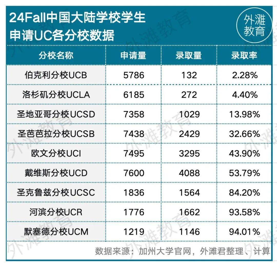 ,对来自中国粹校的学生同样“要求严酷”。24Fall,伯克利分校只为来自中国粹校的学生发出了132份offer,登科率低至2。28%。分校则略显风雅,发出了272份offer,登科率为4。4%。别的,分校的合作也颇为激烈。