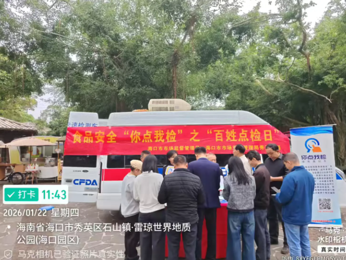 春节前夜,为进一步提拔食物抽检工做参取度,加强人平易近群众对年货食物平安的获得感和对劲度,营制食物平安社会共治共享款式,2026年1月22日,海口市市场监视办理局正在区火山口地质公园开展年货购食物平安“你点我检”之“苍生点检日”宣传勾当。
