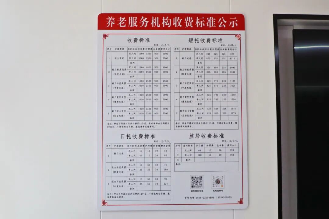 近年来,跟着老龄化历程加速,养老办事需求日益增加,找家靠谱、收费通明的养老机形成为良多家庭关心的核心。当前,进一步提拔养老办事通明度和公信力,为老年人家庭选择养老机构供给无力参考和保障。记者看到外墙夺目吊挂着同一制做的机构运营公示牌,清晰列明机构简介、存案消息、法人登记消息、平安出产许可证及食物运营许可证等各类天分文件;入口处的收费尺度公示栏则对日托、短托、客居等办事项目明码标价,包罗床位费、护理费、伙食费等根本收费内容,机构消息一目了然。
